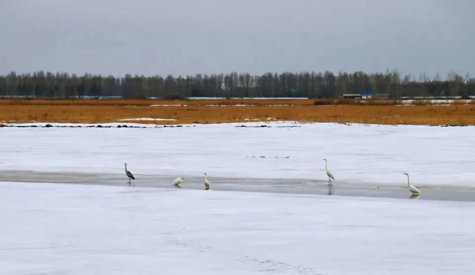 在雁窩島國(guó)家級(jí)生態(tài)濕地自然保護(hù)區(qū)內(nèi)的冰面上,白鸛、灰鸛還有小水雞,三五一組,有的悠閑散步,有的仰頭眺望,有的在融化的雪水中覓食,還有的在低空盤(pán)旋。比往年提前10天到來(lái)的候鳥(niǎo),為雁窩島增添了初春的氣息和生機(jī)。