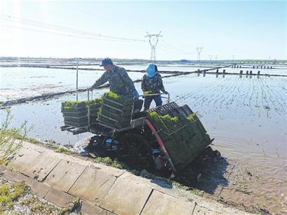 坤站村稻豐糧食種植農(nóng)民專(zhuān)業(yè)合作社理事長(zhǎng)楊軍介紹,受氣溫影響,今年插秧比往年延遲一周左右,為了把時(shí)間搶回來(lái),合作社社員起早貪黑,從早晨四點(diǎn)多就開(kāi)始插秧。合作社今年種植水稻面積3000多畝,為抗低溫、保全苗、奪高產(chǎn),全部采用機(jī)械化插秧,一臺(tái)插秧機(jī)每天可插秧50畝。楊軍說(shuō),去年建設(shè)的水稻公園成為游客網(wǎng)紅打卡地,今年在稻田公園新設(shè)計(jì)一個(gè)慶祝建黨100周年和鄉(xiāng)村振興的彩繪圖案,助力鄉(xiāng)村旅游業(yè)發(fā)展。