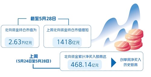 具體看,截至5月28日,北向資金持倉(cāng)市值為2.63萬(wàn)億元,上周北向資金持倉(cāng)市值增加1418億元。