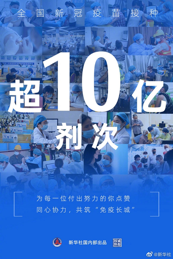 國家衛(wèi)健委6月20日通報,全國新冠疫苗接種超10億劑次,這個數(shù)字來之不易。這場大規(guī)模接種工作,離不開全國人民的共同努力,預計年底前至少70%目標人群接種疫苗。疫情形勢仍然嚴峻,你我同心協(xié)力,共筑“免疫長城”。(記者陳席元 徐鵬航 海報設計 張晨光)