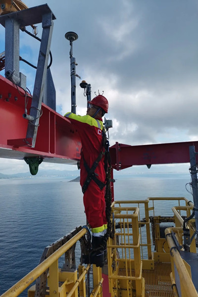 北斗導(dǎo)航設(shè)備除了在中央控制室安裝的北斗 /GNSS 海洋參考位置終端,還需要在鉆井平臺頂部安裝信號接收等設(shè)備。天線布設(shè)的位置、方向、高度等因素都會影響定位系統(tǒng)的精度,為了實(shí)現(xiàn)系統(tǒng)的標(biāo)準(zhǔn)化安裝,團(tuán)隊(duì)成員“親自上陣”選點(diǎn)、布設(shè)、安裝。在接受安全操作相關(guān)培訓(xùn)后,近 20 人次攜帶安全設(shè)備攀爬高度 137 米的平臺井架,進(jìn)行天線安裝及線纜布設(shè)。