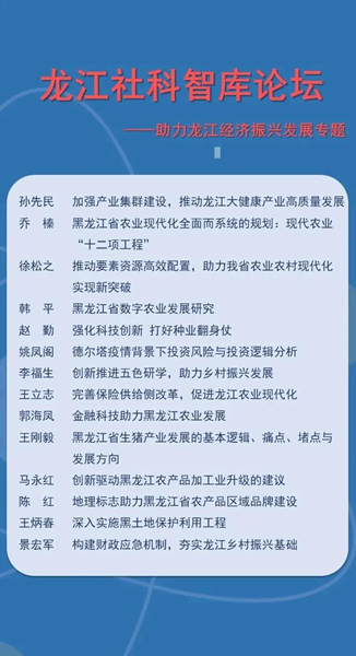 來自省內(nèi)高校、科研院所、企業(yè)的14位專家學(xué)者在會上圍繞“助力龍江經(jīng)濟(jì)振興發(fā)展”這一主題,分別就“加強產(chǎn)業(yè)集群建設(shè),推動龍江大健康產(chǎn)業(yè)高質(zhì)量發(fā)展”“黑龍江省農(nóng)業(yè)現(xiàn)代化全面而系統(tǒng)的規(guī)劃:現(xiàn)代農(nóng)業(yè)‘十二項工程’”“推動要素資源高效配置,助力我省農(nóng)業(yè)農(nóng)村現(xiàn)代化實現(xiàn)新突破”“黑龍江省數(shù)字農(nóng)業(yè)發(fā)展研究”等主題進(jìn)行了發(fā)言。