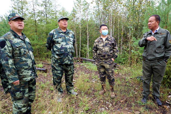 林業(yè)局黨委書記胡守慶(左二)深入檢查指導(dǎo)改造管護(hù)站安全施工工作。