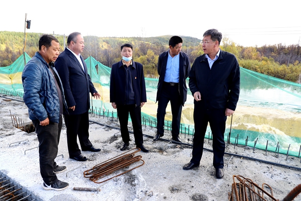 林業(yè)局黨委副書記、局長韓鳳泉(右一)深入在建楚龍溝大橋現(xiàn)場落實(shí)泄洪措施,確保國道G111安全。