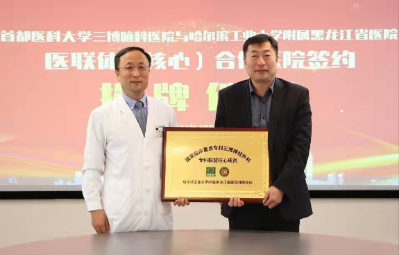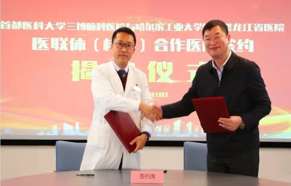 黑龍江省醫(yī)院黨委書(shū)記劉宏石、副院長(zhǎng)陳鵬,首都醫(yī)科大學(xué)三博腦科醫(yī)院院長(zhǎng)徐向英、黨委書(shū)記王保國(guó)、副院長(zhǎng)張宏偉等領(lǐng)導(dǎo)出席,并為牌匾揭牌。黑龍江省醫(yī)院神經(jīng)外二科程化坤主任、護(hù)理部冷菲菲主任及三博腦科醫(yī)院相關(guān)科室負(fù)責(zé)人等參加了本次簽約揭牌儀式。