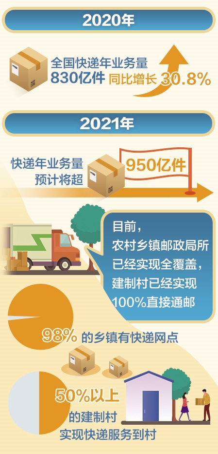 伴隨著農(nóng)村電商的蓬勃發(fā)展和農(nóng)村市場潛力的激活,主要快遞品牌不斷從“下鄉(xiāng)”向“進村”邁進。目前,農(nóng)村鄉(xiāng)鎮(zhèn)郵政局所已實現(xiàn)全覆蓋,建制村實現(xiàn)100%直接通郵;98%的鄉(xiāng)鎮(zhèn)有快遞網(wǎng)點,一半以上的建制村實現(xiàn)快遞服務到村。