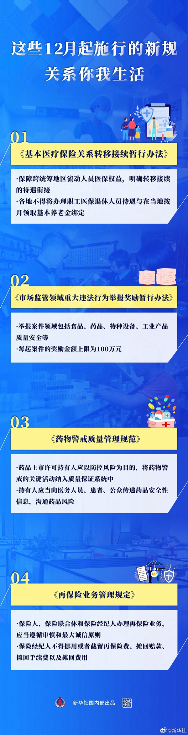 明確醫(yī)保關系的轉(zhuǎn)移接續(xù)辦法,讓跨統(tǒng)籌地區(qū)流動人員的醫(yī)保權(quán)益更有保障;舉報市場監(jiān)管領域重大違法行為可獲獎勵,每起案件的獎勵金額上限為100萬元;進一步完善藥物警戒質(zhì)量管理規(guī)范,強化藥品上市許可持有人的安全監(jiān)管責任……戳大圖,哪條你最期待?(新華社記者白陽 海報設計張晨光)