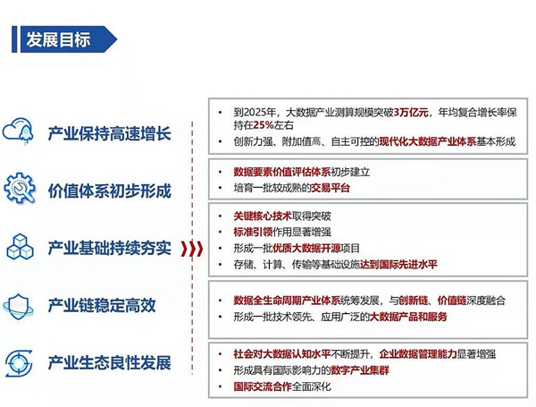 規(guī)劃明確,到2025年,大數(shù)據(jù)產(chǎn)業(yè)測算規(guī)模突破3萬億元。其中特別提出,數(shù)據(jù)要素價(jià)值評估體系初步建立;產(chǎn)業(yè)基礎(chǔ)持續(xù)夯實(shí),關(guān)鍵核心技術(shù)取得突破;形成一批技術(shù)領(lǐng)先、應(yīng)用廣泛的大數(shù)據(jù)產(chǎn)品和服務(wù)。