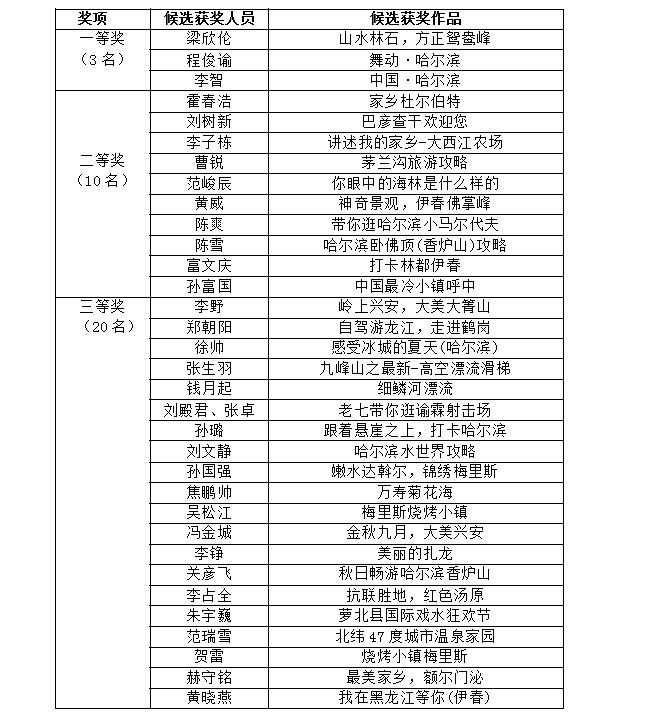 黑龍江文化旅游短視頻新媒體營(yíng)銷創(chuàng)作大賽獲獎(jiǎng)名單