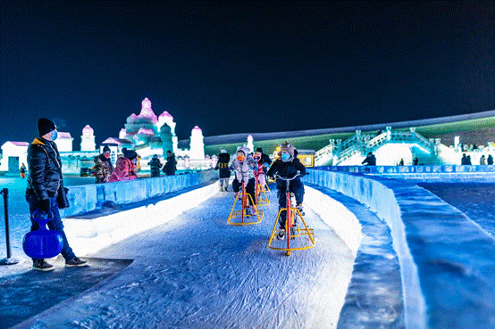 今年園區(qū)的另一個(gè)“人氣王”,非單車城堡莫屬。單車城堡內(nèi)的冰上自行車項(xiàng)目,每天都吸引著大量游客騎行體驗(yàn)。在冰面上掌控方向不是件容易事,騎著冰上自行車,穿行于美麗的冰城堡中,對游客來說是一種前所未有的奇妙體驗(yàn)。