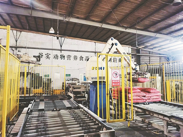 谷實生物集團股份有限公司車間里的機器人碼垛設備。