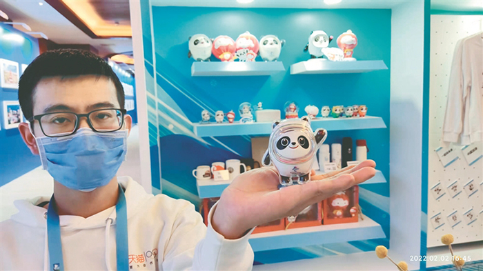 在新聞中心一樓中庭及走廊設(shè)有2022年冬奧會(huì)熱銷特許商品展區(qū),為媒體提供線上定制和購(gòu)買特許商品服務(wù)。遺憾的是經(jīng)過(guò)1日一天的熱賣,幾乎所有“冰墩墩”玩偶都已告罄,可見媒體記者也敵擋不住超級(jí)可愛的冰墩墩的魅力。