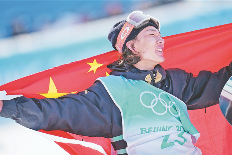 2月15日,中國選手蘇翊鳴在奪冠后慶祝。 當日,北京2022年冬奧會單板滑雪男子大跳臺決賽在北京首鋼滑雪大跳臺舉行。中國選手蘇翊鳴奪得金牌。