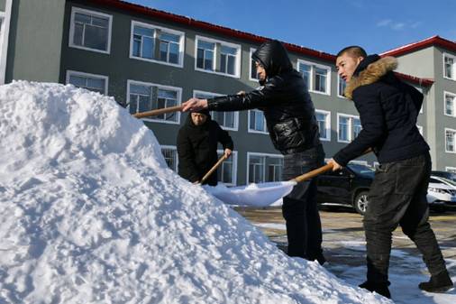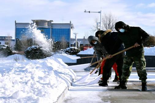 皚皚白雪中,190余名隊員不畏嚴寒,有的將冰層鏟起,有的則用鐵鍬將積雪運至道路兩側(cè)不影響交通的地方。大家齊心協(xié)力逐段清理、有序推進清雪工作,不到10:30就為附近干部職工群眾創(chuàng)造了一個安全、順暢、良好的生產(chǎn)生活環(huán)境。