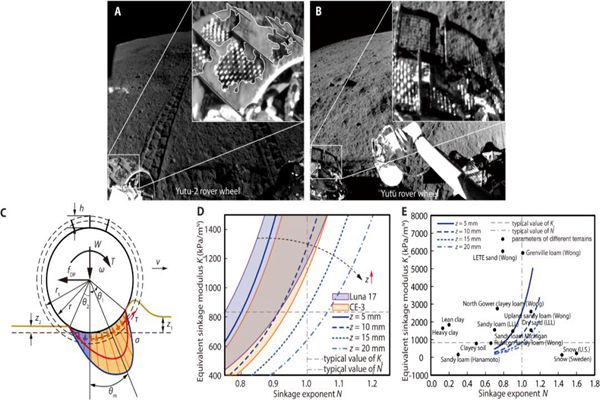 團(tuán)隊(duì)成員根據(jù)月球車車輪與月面作用的信息和地面力學(xué)模型估計(jì)了月壤的力學(xué)特性,結(jié)果表明,月壤風(fēng)化層的承壓特性與地球上的干沙和沙壤土類似,與美國阿波羅計(jì)劃中的典型月壤相比具有更強(qiáng)的承壓特性。在多個(gè)不同地點(diǎn)的圖像中,觀察到“玉兔二號”車輪粘附有大塊團(tuán)狀土壤,而“玉兔號”車輪基本不存在粘土現(xiàn)象,這表明,嫦娥四號著陸區(qū)附近月壤內(nèi)聚力較大,其原因可能是包含較高比例的凝集物,使土壤顆粒經(jīng)車輪碾壓更易團(tuán)聚。