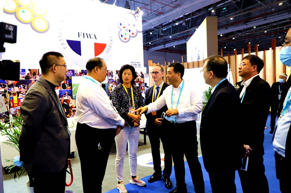 阿木爾林業(yè)局北極冰藍(lán)莓酒莊生產(chǎn)的冰酒、紅酒等產(chǎn)品,在第四屆上海國(guó)際進(jìn)出口博覽會(huì)上展出。大興安嶺林業(yè)集團(tuán)公司黨委副書記、總經(jīng)理李軍(左五)與國(guó)際友人及林業(yè)局參展人員親切交談,了解酒莊產(chǎn)品特點(diǎn)、市場(chǎng)營(yíng)銷等情況(王力 攝)