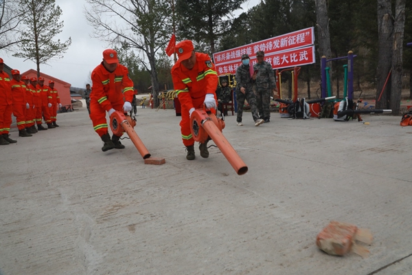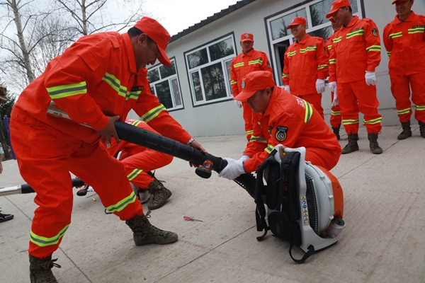 阿木爾林業(yè)局依東林場(chǎng)專業(yè)撲火隊(duì)員在進(jìn)行拆解安裝風(fēng)力滅火機(jī)比賽(王力 攝)