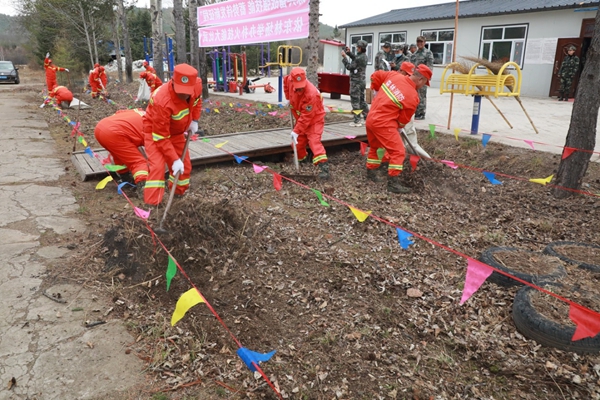 開設(shè)防火隔離帶,是阻擋火源的有效方法。依東林場(chǎng)將環(huán)境衛(wèi)生整治與防火科目結(jié)合起來(lái),在門前擺下擂臺(tái),拉出橫線設(shè)立分區(qū),六組隊(duì)員進(jìn)入場(chǎng)地爭(zhēng)分奪秒、互不相讓,有的耙、有的裝,一會(huì)功夫一條干凈、規(guī)范的“隔離帶”出現(xiàn)在眼前。