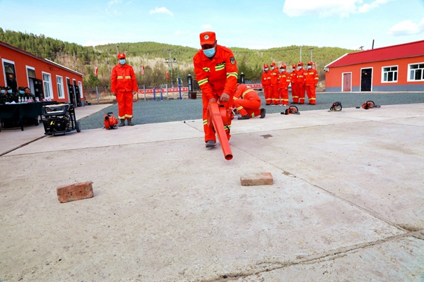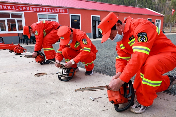 阿木爾林業(yè)局綠林林場專業(yè)撲火隊員在進行風力滅火機、油鋸的拆裝維修使用比賽(王力 攝)