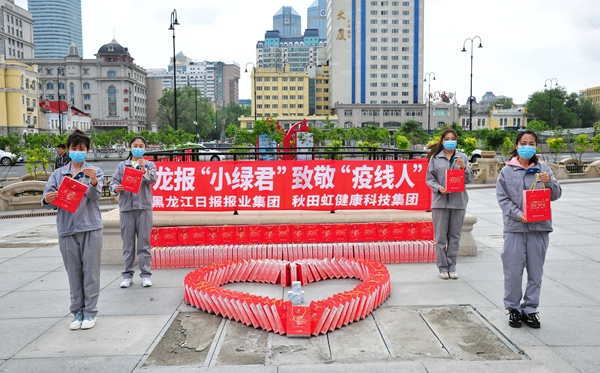 5月27日,由黑龍江日報報業(yè)集團和哈爾濱秋田虹健康科技集團共同發(fā)起的“龍報‘小綠君’,致敬‘疫線人’”系列公益活動,在哈爾濱火車站南廣場正式啟動。黑龍江日報報業(yè)集團、哈爾濱市委宣傳部、哈爾濱市公安局巡特警支隊、哈爾濱秋田虹健康科技集團領導出席啟動儀式。