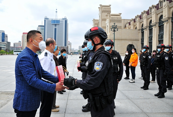 公益活動首批慰問對象是剛從抗疫一線歸來的哈爾濱市公安局巡特警支隊隊員。本次疫情期間,他們馳援五常市拉林鎮(zhèn)、哈爾濱市平房區(qū)和賓縣,先后核查車輛3700余臺,幫助群眾1100多人,為群眾配送餐食10萬余份、飲用水20余萬瓶、防疫物資9000余件,用血肉身軀筑起了抗擊疫情的鋼鐵長城,詮釋了“疫情當前,特警在先”的使命擔當?!案兄x黑龍江日報報業(yè)集團和愛心企業(yè)送來健康產(chǎn)品。今后我們會一如繼往做好本職工作,哪里需要哪里上,當好人民的忠誠衛(wèi)士?!苯舆^“小綠君”,哈爾濱市公安局巡特警支隊特警一大隊二中隊教導員劉甲洲一臉幸福。