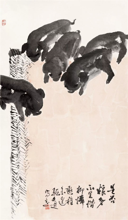 湯文選的人物、山水、花鳥、墨虎等一系列作品,融會著、貫穿著“三種傳統(tǒng)”?;螂[或顯,或化解之,或凝聚之,或熔裁之,或獨(dú)造之?!叭N傳統(tǒng)”,可概括為現(xiàn)實主義在中國畫發(fā)展歷程中的三段式,亦曰交叉出現(xiàn)的不同歷史內(nèi)涵、文化反映的三種藝術(shù)狀態(tài):首先,是古代現(xiàn)實主義傳統(tǒng)——“外師造化,中得心源”。其二,是“五四”現(xiàn)實主義傳統(tǒng)——融合西法,崇尚寫實。其三,是新中國成立后倡導(dǎo)的革命現(xiàn)實主義傳統(tǒng)。深入火熱斗爭,深入工農(nóng)兵。學(xué)習(xí)延安木刻,學(xué)習(xí)民間年畫,學(xué)習(xí)蘇聯(lián)油畫現(xiàn)實主義的創(chuàng)作方法(50年代)。其后,“一手伸向生活,一手伸向傳統(tǒng)”(60年代)。在以上“三種傳統(tǒng)”的交匯點(diǎn)上,伸延出湯文選早期和中期的現(xiàn)實主義創(chuàng)作之路。湯文選中國畫藝術(shù)的現(xiàn)實主義,其主要特征為積極的入世態(tài)度,強(qiáng)烈的人文主義色彩,個性、民族性與時代性的完美統(tǒng)一,以及嚴(yán)肅的歷史使命感。