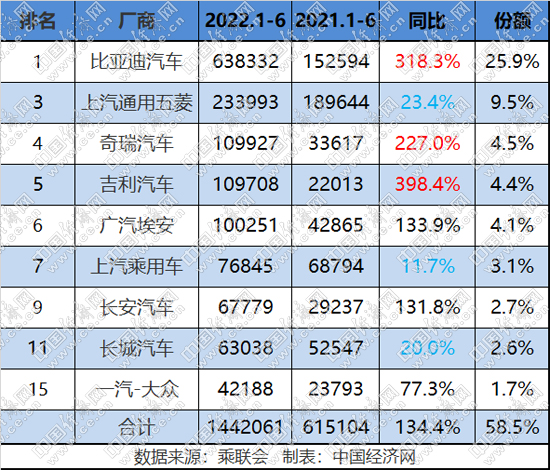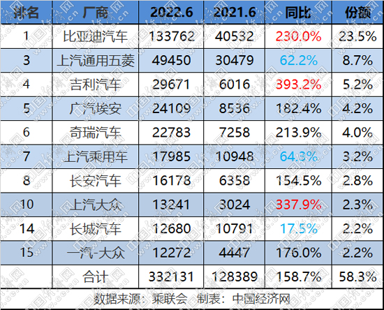 在乘聯(lián)會(huì)發(fā)布的6月新能源乘用車批發(fā)銷量廠商排名(TOP15)中,傳統(tǒng)品牌占據(jù)10席,共計(jì)銷售33.2萬(wàn)輛,同比增長(zhǎng)158.7%,市場(chǎng)份額接近六成,達(dá)到58.3%,1-6月,傳統(tǒng)品牌新能源累計(jì)銷售144.2萬(wàn)輛,同比增長(zhǎng)134.4%,份額同樣接近六成,為58.5%。