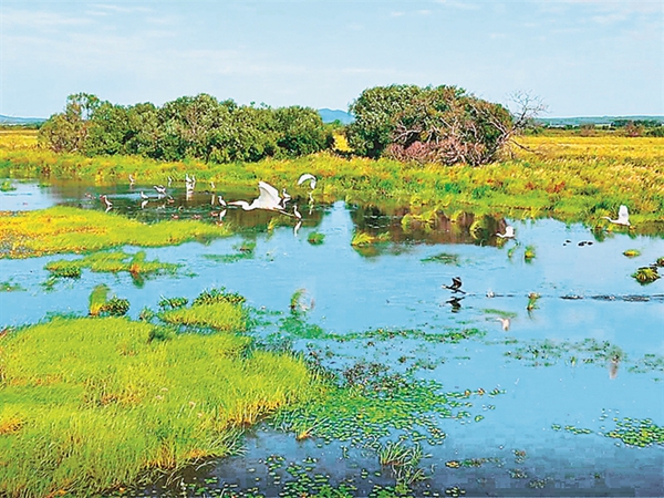 目前,保護(hù)區(qū)濕地草木蔥郁豐茂,河水波光粼粼,白鷺、蒼鷺、東方白鸛等珍禽在空中翱翔,呈現(xiàn)出生態(tài)和諧的勃勃生機(jī)。