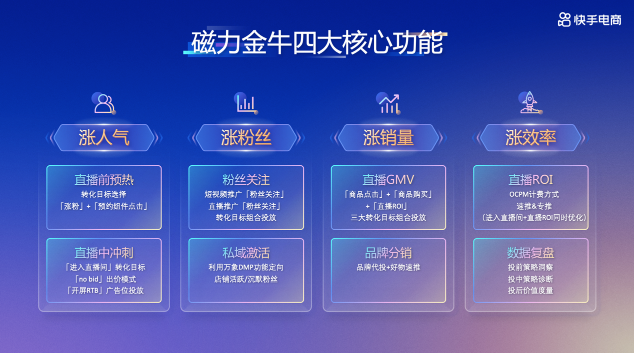 本次活動(dòng),快手磁力金牛和快手電商服務(wù)商也宣布推出一系列政策,推動(dòng)常熟女裝商家電商生意增長(zhǎng)。作為電商生意的加速器,快手磁力金牛讓商家投流更精準(zhǔn)、效率更高、效果更好。在賬號(hào)啟動(dòng)期,商家可借助磁力金牛進(jìn)行私域起量,并根據(jù)貨盤(pán)制定營(yíng)銷(xiāo)策略;在賬號(hào)成長(zhǎng)期,商家可依據(jù)S-A-B直播策略模型,使用磁力金牛進(jìn)行差異化投流、精細(xì)化運(yùn)營(yíng);在賬號(hào)成熟期,磁力金牛可以在品效協(xié)同下進(jìn)行差異化拓客,引入新流量。