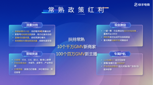 在流量扶持方面,新手常熟商家可享受“青云計(jì)劃”每天8億流量扶持,還有短視頻流量扶持、直播間流量保量、全站資源位曝光、短視頻掛車(chē)疊加獎(jiǎng)勵(lì)等;在營(yíng)銷(xiāo)資源方面,快手電商打造每月高頻的營(yíng)銷(xiāo)場(chǎng)景,包括大促、節(jié)日、行業(yè)品類(lèi)活動(dòng)、寵粉節(jié)等,并為常熟商家提供活動(dòng)補(bǔ)貼,激活品牌動(dòng)銷(xiāo);此外還有最高價(jià)值100萬(wàn)的商業(yè)化對(duì)投政策、周任務(wù)躍遷達(dá)成平臺(tái)加碼獎(jiǎng)勵(lì)等現(xiàn)金激勵(lì),以及1V1專(zhuān)屬小二全方位指導(dǎo)等專(zhuān)屬護(hù)航。