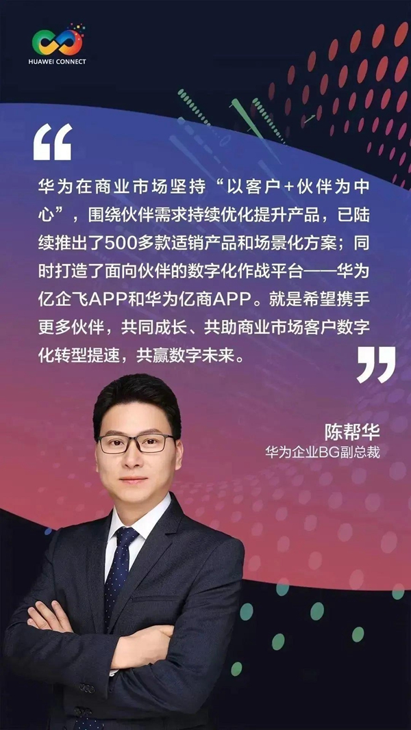 對(duì)此,陳幫華表示,華為在商業(yè)市場(chǎng)堅(jiān)持“以客戶+伙伴為中心”,圍繞伙伴需求持續(xù)優(yōu)化提升產(chǎn)品,已陸續(xù)推出了500多款適銷產(chǎn)品和場(chǎng)景化方案;同時(shí)打造了面向伙伴的數(shù)字化作戰(zhàn)平臺(tái)——華為億企飛APP和華為億商APP。就是希望攜手更多伙伴,共同成長、共助商業(yè)市場(chǎng)客戶數(shù)字化轉(zhuǎn)型提速,共贏數(shù)字未來。