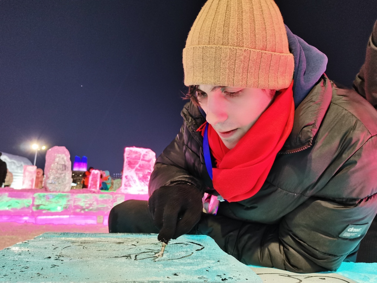 傍晚,中外青少年在流光溢彩、美輪美奐的哈爾濱冰雪大世界中感知冰雪藝術(shù)的魅力。在冰雪藝術(shù)體驗(yàn)營(yíng)聆聽冰雕制作過(guò)程,學(xué)習(xí)將冰與中國(guó)傳統(tǒng)木刻版畫相結(jié)合,親手設(shè)計(jì)制作屬于自己獨(dú)一無(wú)二的冰版畫,體驗(yàn)冰雪帶來(lái)的樂(lè)趣。