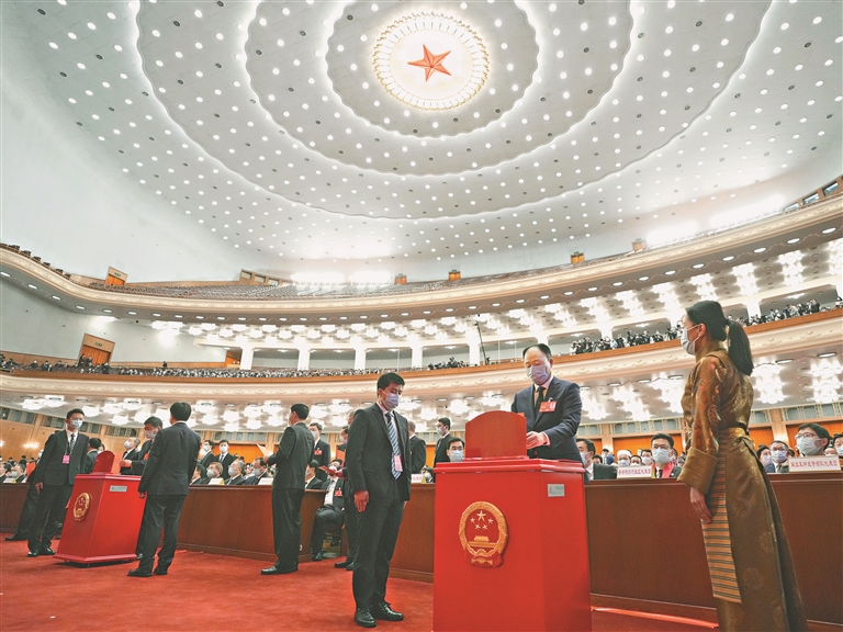 3月10日,十四屆全國人大一次會(huì)議在北京人民大會(huì)堂舉行第三次全體會(huì)議。這是代表在投票。新華社記者 王毓國攝