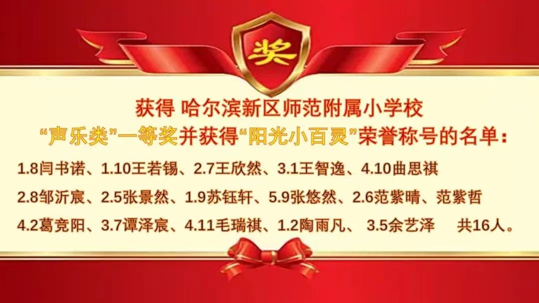 閆書諾同學的班主任馬男老師很重視孩子們的全面發(fā)展,鼓勵孩子們積極參加各種文體活動。在馬老師的積極引導下,閆書諾同學在學校藝術節(jié)的聲樂比賽中,以一曲《童心向黨》喜獲“聲樂類”一等獎和“陽光小百靈”榮譽稱號。
