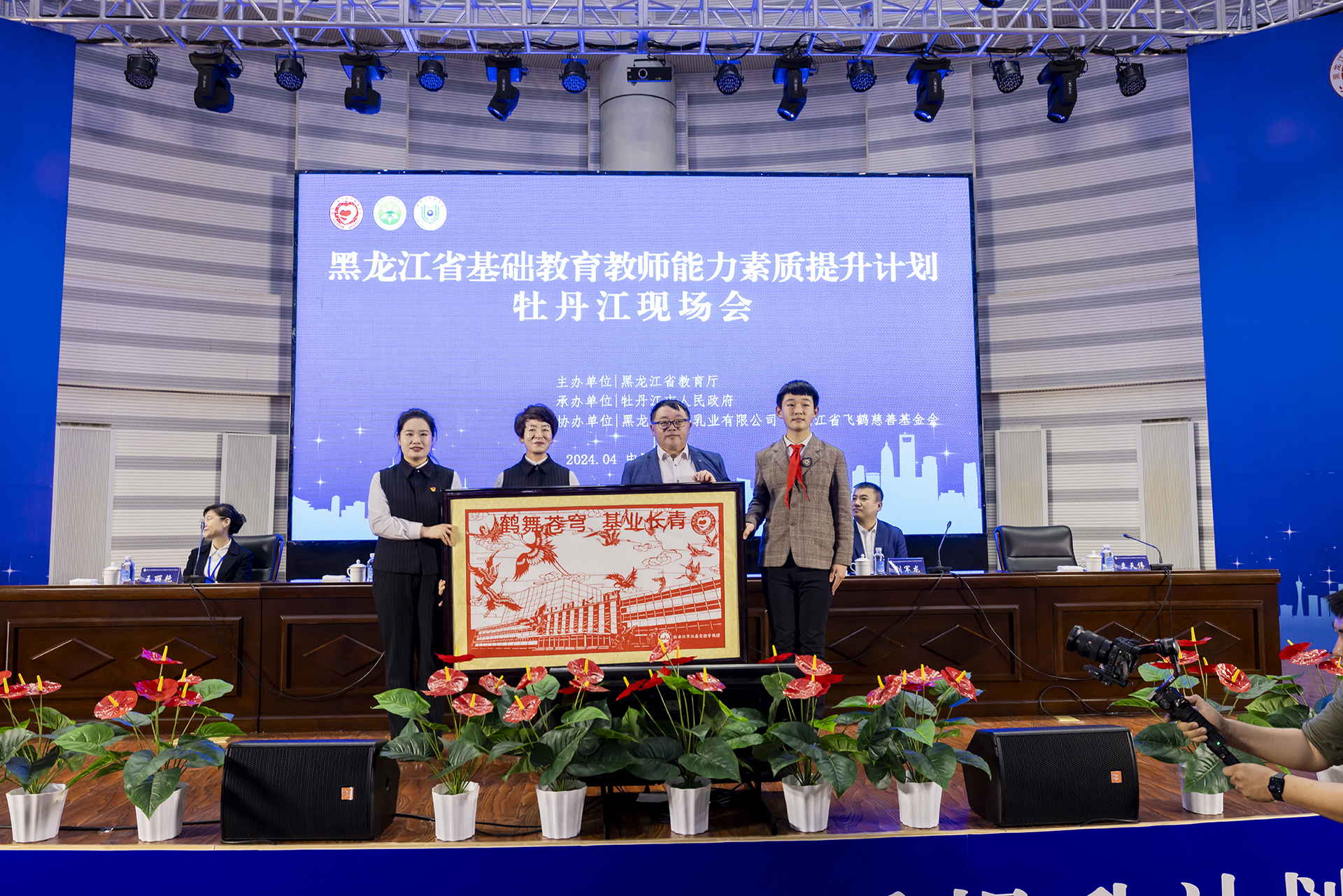 會議現(xiàn)場,牡丹江市江南實驗學校向中國飛鶴贈送剪紙作品,以表示全省師生對中國飛鶴助力龍江教育公益行動的感謝。