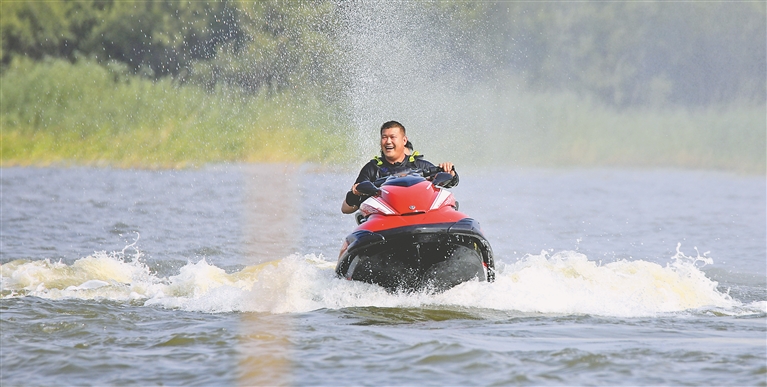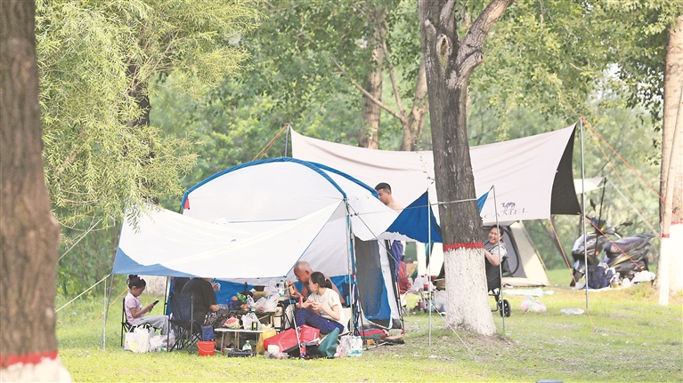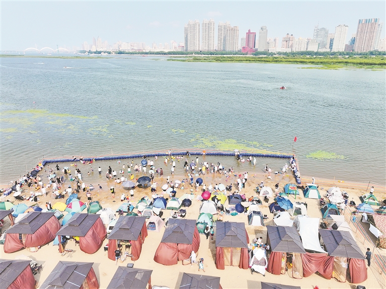 各個景區(qū)內,游客們撐起太陽傘,戴上遮陽帽,以抵御紫外線的照射。松花江畔的幾處浴場,人頭攢動,家長帶著孩子在這里戲水納涼。江邊的綠蔭里,滿是露營的帳篷,市民吃著冰西瓜、喝著涼啤酒,愜意地避暑。本報記者 張澍攝