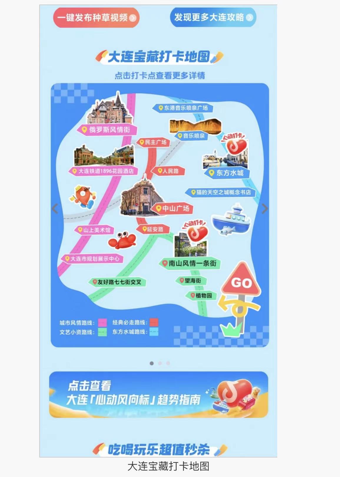 線上推廣方面,大連市文化和旅游局與抖音生活服務共同搭建“心動大連”話題頁與“活動主會場”頁面,聚合達人、用戶、媒體的多樣化內容以及本地精選文旅商家,集中推廣大連文旅資源和特色消費場景。費啟鳴、婁藝瀟、喜劇人大鎖等多位大連籍明星藝人,受邀作為“心動大連推薦官”為大連文旅打Call?;顒訉l(fā)起“心動直播周”促消費專場直播,設定周播主題,宣傳城市吃喝玩樂特色內容?;顒舆€將結合大連文旅特色以及中秋節(jié)點,發(fā)起“海邊的大連有多浪漫”“中秋來大連實現海鮮自由”等熱門話題造勢。(抖音)