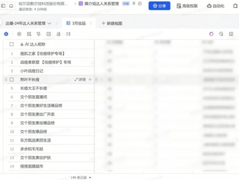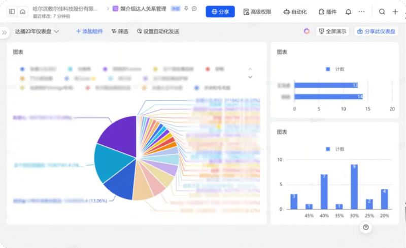 由于器械字號(hào)產(chǎn)品的特殊性,現(xiàn)在敷爾佳通過飛書在線文檔審批達(dá)人,將達(dá)人數(shù)據(jù)填寫上報(bào),上級(jí)在線同步審批達(dá)人,跟進(jìn)確定合作。直播中,用飛書云盤儲(chǔ)存資料,將達(dá)播錄屏,產(chǎn)品資料等數(shù)據(jù),同步云盤,方便各部門查看,調(diào)取相關(guān)資料。直播后,利用飛書多維表格將達(dá)人信息,合作傭金,產(chǎn)出 GMV,對(duì)接人等重要信息歸攏一起,形成多維表格方便組織內(nèi)互相查閱填寫, 通過儀表盤的功能體現(xiàn)出哪些達(dá)人是優(yōu)質(zhì)合作達(dá)人,并為二次投放合作提供了參考價(jià)值。