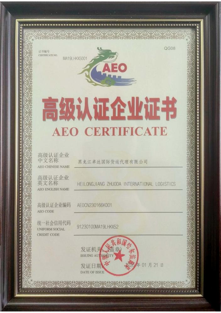 圖1黑龍江卓達(dá)國際貨運代理有限公司AEO認(rèn)證證書