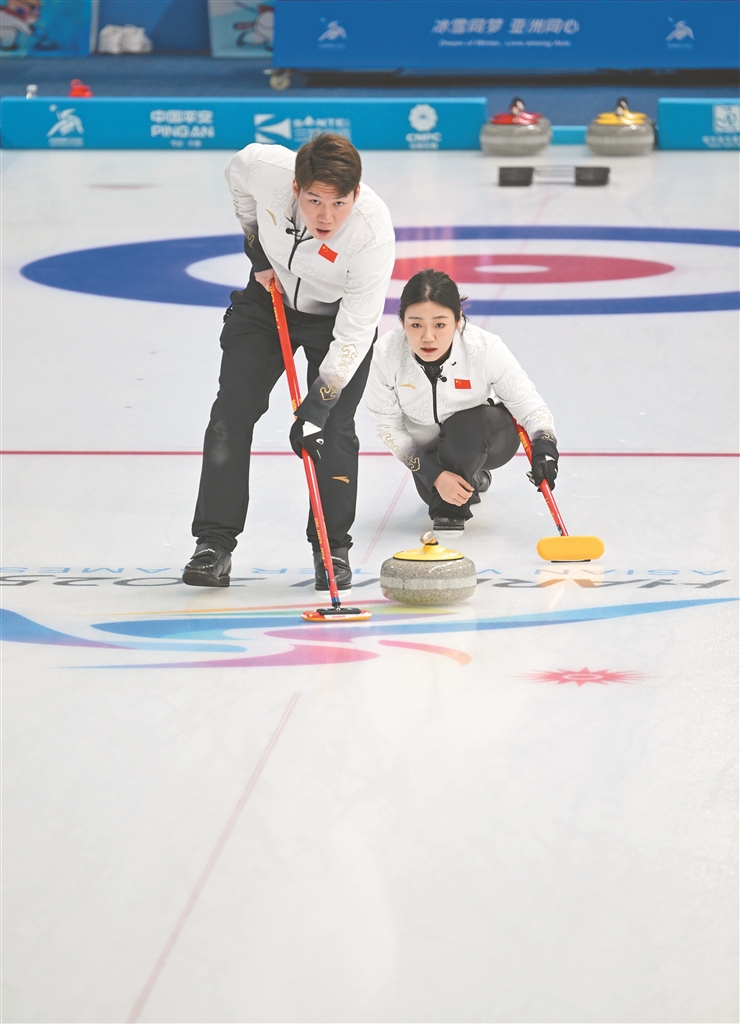 在6日上午進(jìn)行的冰壺混雙第六輪比賽中,中國(guó)隊(duì)王智宇/韓雨組合在現(xiàn)場(chǎng)觀眾的歡呼聲中,以6比4拿下了強(qiáng)勁的韓國(guó)隊(duì)。