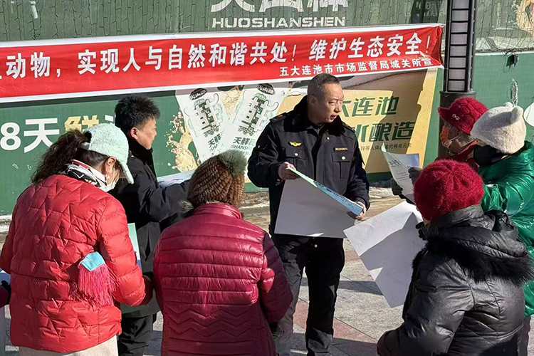城關(guān)監(jiān)管所執(zhí)法人員在五大連池市鑫瑞廣場(chǎng)開展禁止非法捕獵野生動(dòng)物宣傳活動(dòng)(王力 攝)