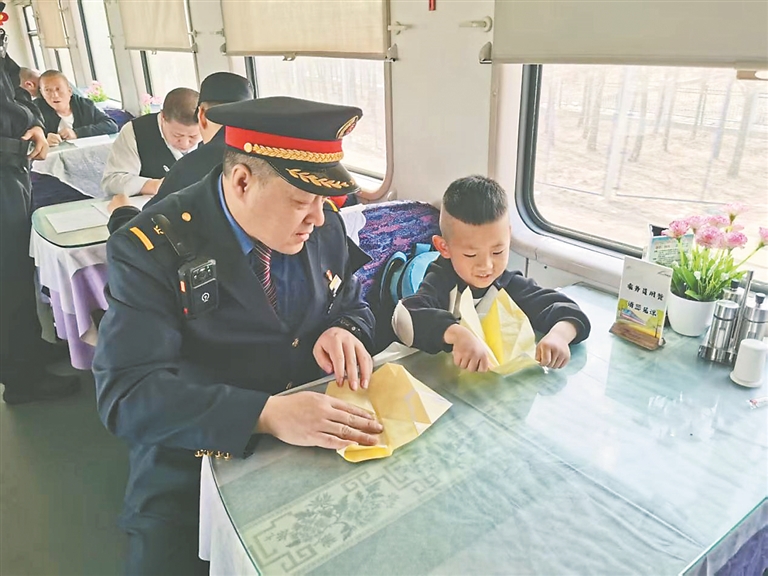本報訊(張蔚萌 王夢 記者 王迪)近日,由鄭州開往海拉爾的K927次列車從昌圖站駛出后,列車長孫志強接到12306轉(zhuǎn)發(fā)的緊急尋人求助工單。經(jīng)過與客服溝通了解后得知,旅客劉玲玲帶6歲兒子劉俊澤從沈陽北站乘車至昌圖站,因下車時忙于整理行李,將座位上熟睡的孩子遺落在列車上。列車長孫志強通過對講機立即組織各節(jié)車廂列車員尋找孩子,確定孩子位置后迅速趕到現(xiàn)場。為了緩解孩子的緊張情緒,他化身“臨時爸爸”,將孩子帶到了餐車,不僅準備了一些自帶的小零食,還陪孩子一起折紙飛機。當列車停靠長春站后,孫志強按照其母親劉玲玲的要求,將孩子安全移交給長春站工作人員,等待其家屬前來接領(lǐng)。