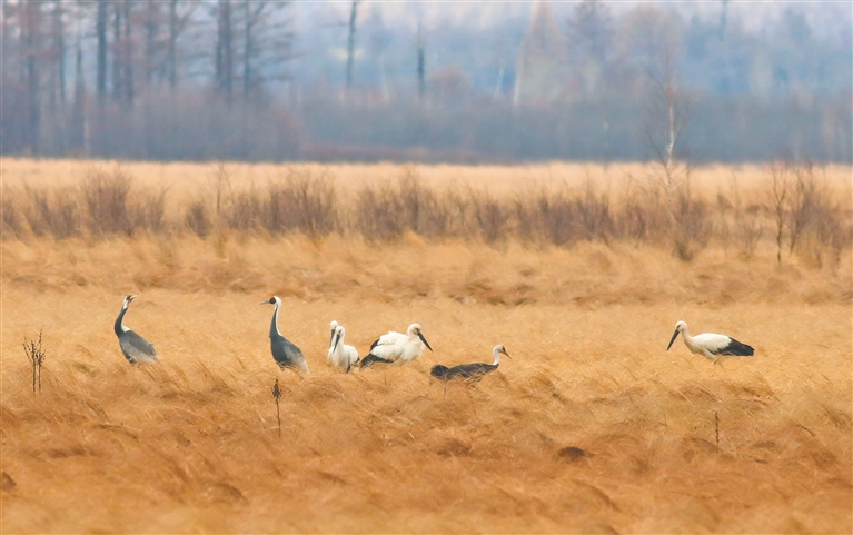 白頭鶴、白枕鶴和東方白鸛同框。李衛(wèi)東攝