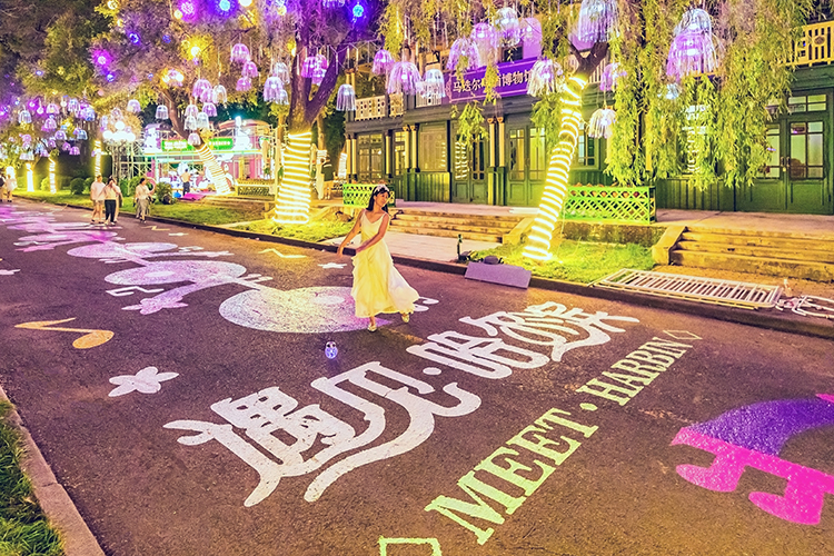 傍晚時分,通往演出現(xiàn)場的《遇見·哈爾濱》網(wǎng)紅街,也吸引了眾多游客駐足打卡。整條街道的地面,通過彩繪表現(xiàn)“浪漫”“愛情”和“遇見·哈爾濱”三大主題,滿是手繪的愛心和繽紛花朵,路兩旁的樹上還精心布置了玫瑰花束和水母燈,直接將浪漫值拉滿。游客們擺出或站、或坐、或跳起等姿勢,無需修圖,隨手一拍都是浪漫大片。網(wǎng)紅街不僅好拍,更精彩、好看。