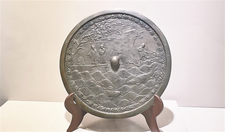 本次展出的距今已有千年歷史的“山水人物故事銅鏡”。本報記者 李淅攝