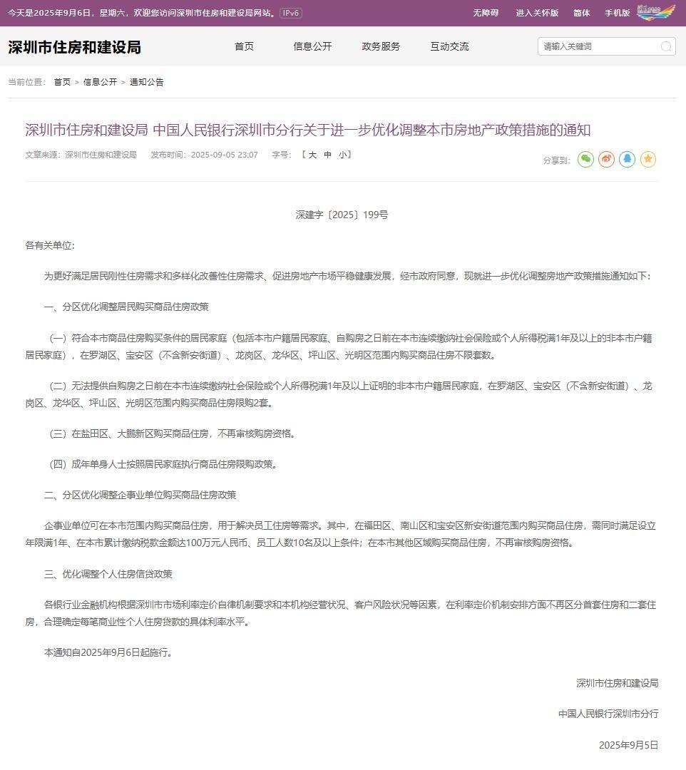 為進(jìn)一步滿足居民住房需求,促進(jìn)房地產(chǎn)市場(chǎng)平穩(wěn)健康發(fā)展,深圳市自2025年9月6日起優(yōu)化調(diào)整房地產(chǎn)政策,鹽田區(qū)、大鵬新區(qū)購(gòu)買商品住房不再審核購(gòu)房資格,其他部分區(qū)域也大幅放寬限購(gòu)條件。