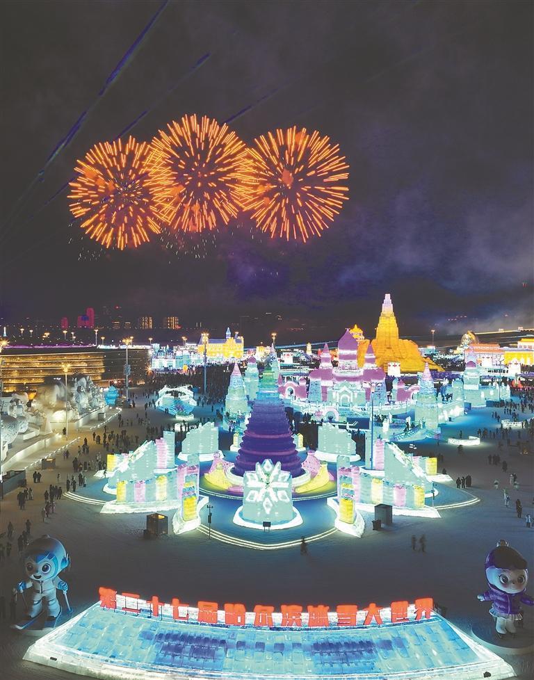 哈爾濱冰雪大世界也迎來了璀璨的煙花時刻。漫天煙花在零下20攝氏度的夜空綻放,游客們在冰雪城堡間穿梭歡呼迎接新年。