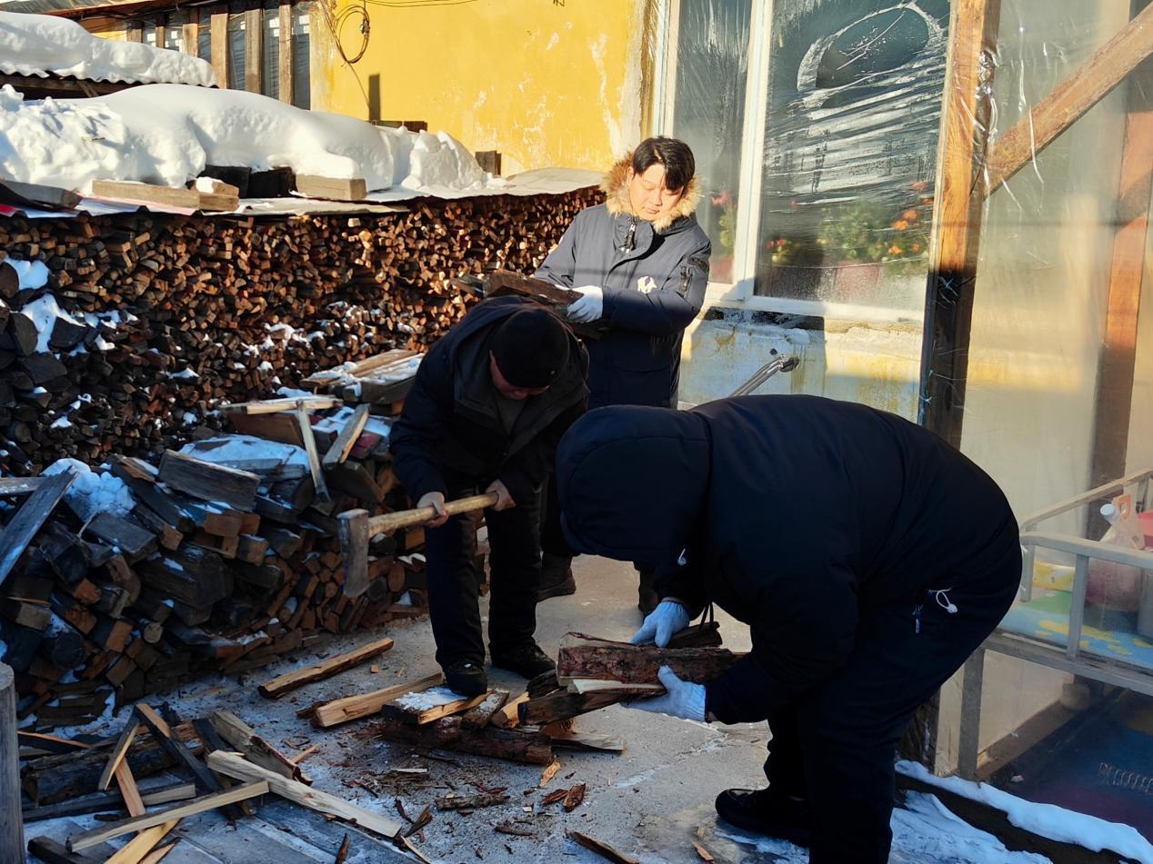 林場黨員先鋒隊隊員幫助困難職工準備取暖燒柴(陶文玲 攝)