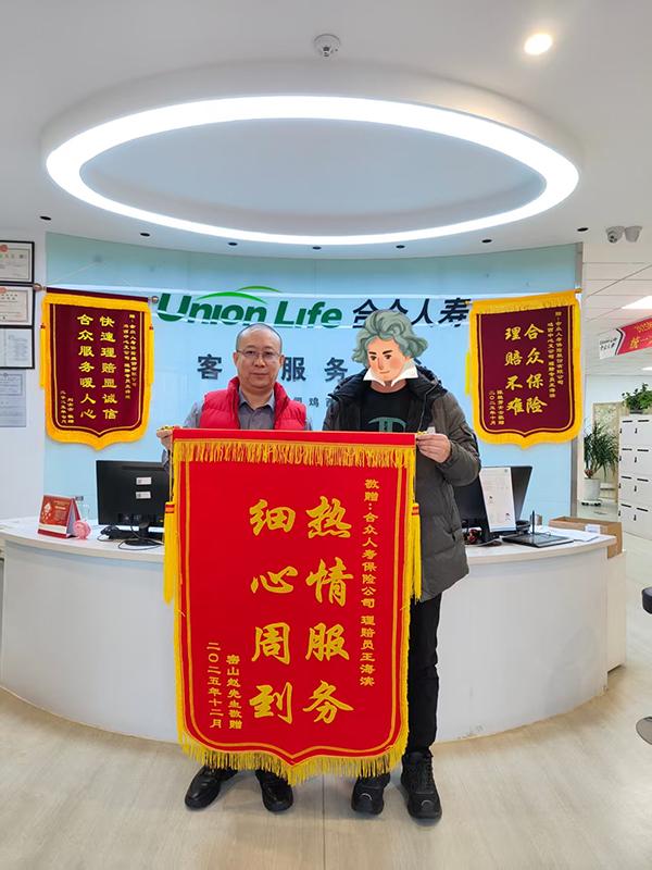 2026年1月5日,Z先生的兒子特意來到中支柜面,親手送來一面感謝的錦旗,書寫“熱情服務 細心周到”以此表達他們深深的謝意。錦旗上熠熠生輝的字句,不僅是對理賠人員專業(yè)服務的高度認可,更是對合眾人壽溫暖關懷的由衷贊譽,彰顯了合眾人壽在客戶心中樹立的良好形象以及雙方之間深厚的信任與情誼。