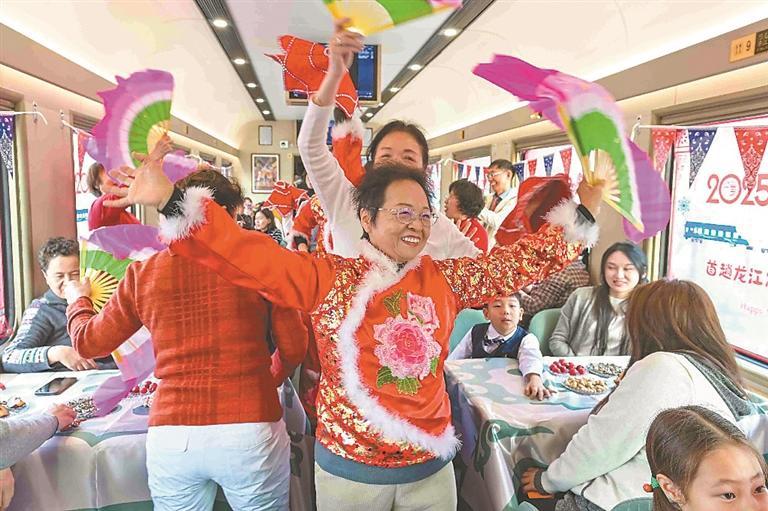2月5日18時20分,K7041次“東北大花”主題列車從哈爾濱站緩緩駛出,一路向北,駛向漠河。車廂內(nèi),來自大興安嶺的鄂倫春族非遺代表性傳承人,現(xiàn)場展示用樺樹皮制作的手工藝品,列車工作人員身著民俗服飾帶領游客剪窗花,東北秧歌、二人轉(zhuǎn)表演更是點燃了旅途熱情。